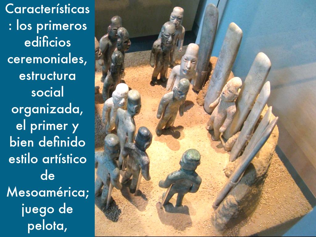 Características: los primeros edificios ceremoniales, estructura social organizada, el primer y bien definido estilo artístico de Mesoamérica; juego de pelota, sistemas calendáricos y escritura.