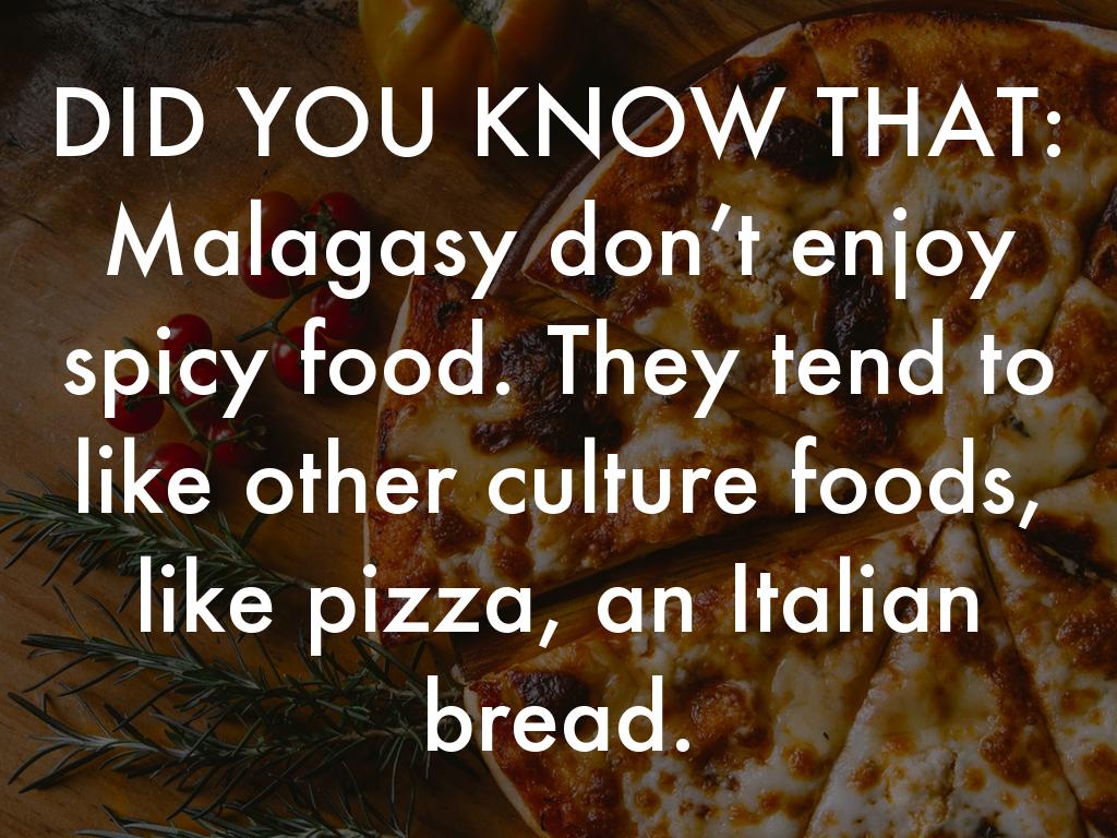 Malagasy don’t enjoy spicy food. They tend to like other culture foods, like pizza, an Italian bread.