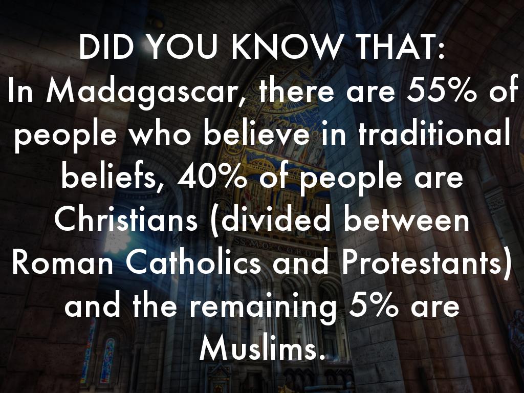 In Madagascar, there are 55% of people who believe in traditional beliefs, 40% of people are Christians (divided between Roman Catholics and Protestants) and the remaining 5% are Muslims.