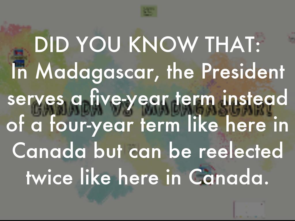In Madagascar, the President serves a five-year term instead of a four-year term like here in Canada but can be reelected twice like here in Canada.