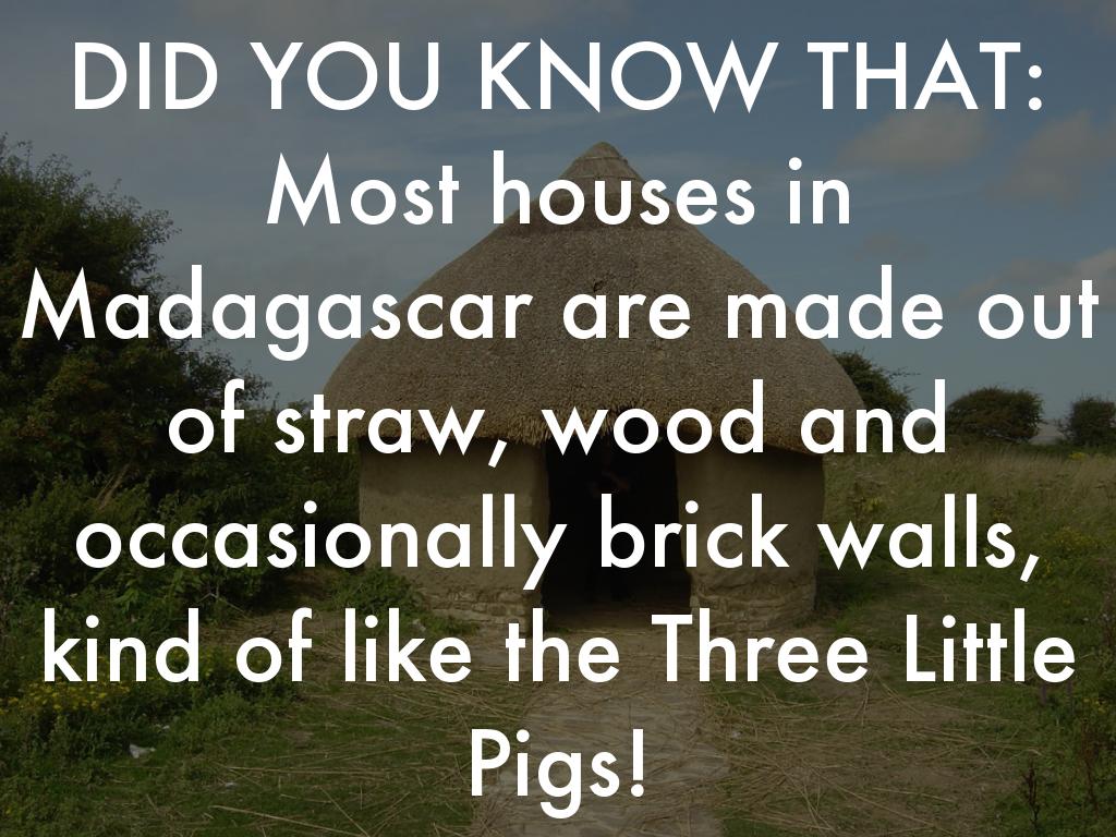 Most houses in Madagascar are made out of straw, wood and occasionally brick walls, kind of like the Three Little Pigs!