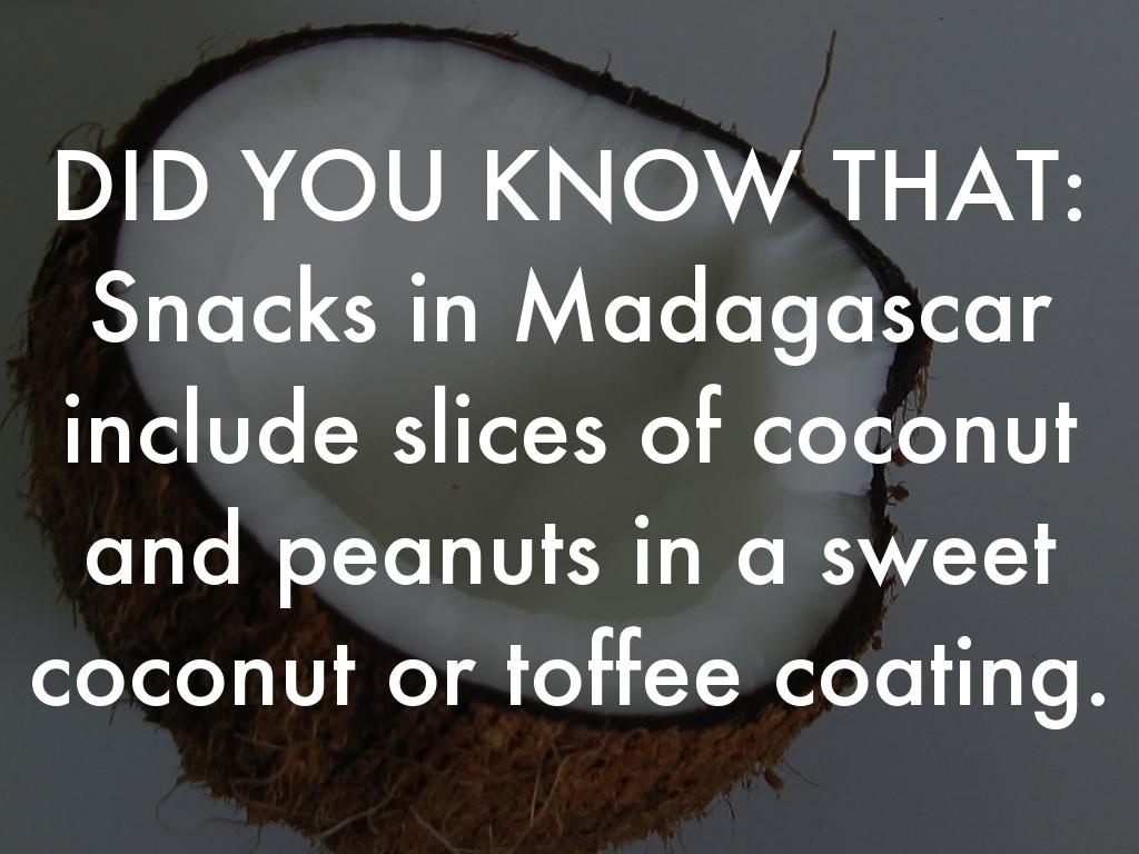 Snacks in Madagascar include slices of coconut and peanuts in a sweet coconut or toffee coating.