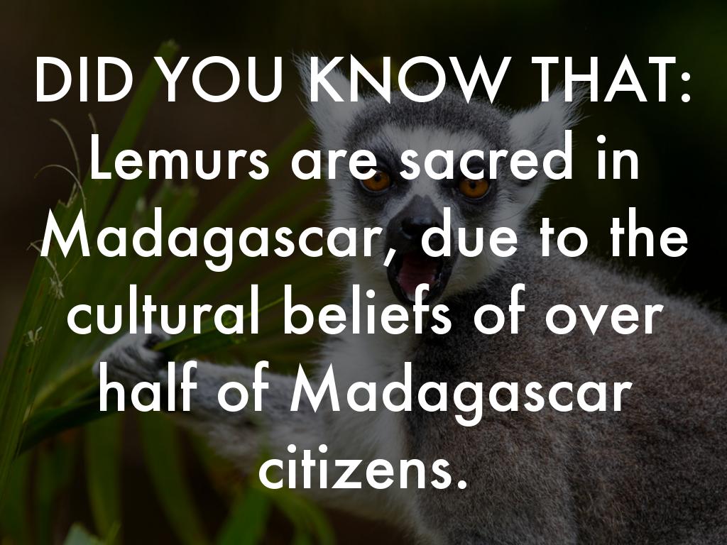 Lemurs are sacred in Madagascar, due to the cultural beliefs of over half of Madagascar citizens.