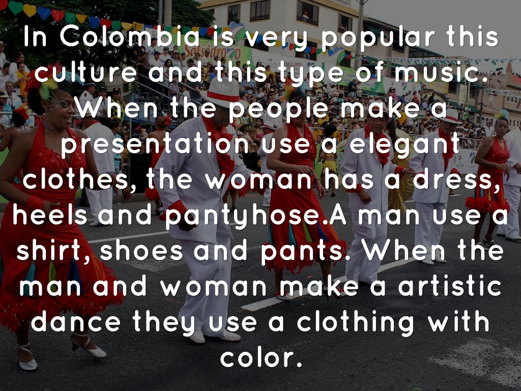 In Colombia is very popular this culture and this type of music. When the people make a presentation use a elegant clothes, the woman has a dress, heels and pantyhose.A man use a shirt, shoes and pants. When the man and woman make a artistic dance they use a clothing with color.