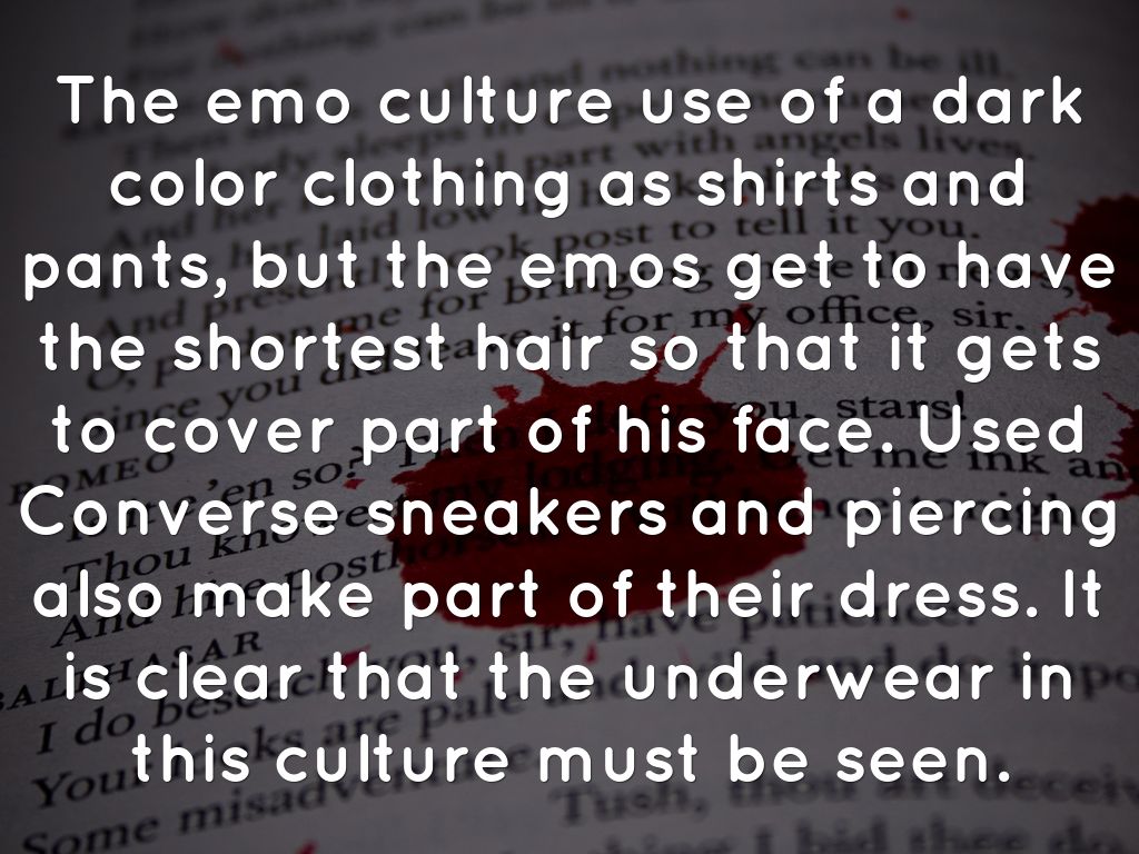 The emo culture use of a dark color clothing as shirts and pants, but the emos get to have the shortest hair so that it gets to cover part of his face. Used Converse sneakers and piercing also make part of their dress. It is clear that the underwear in this culture must be seen.