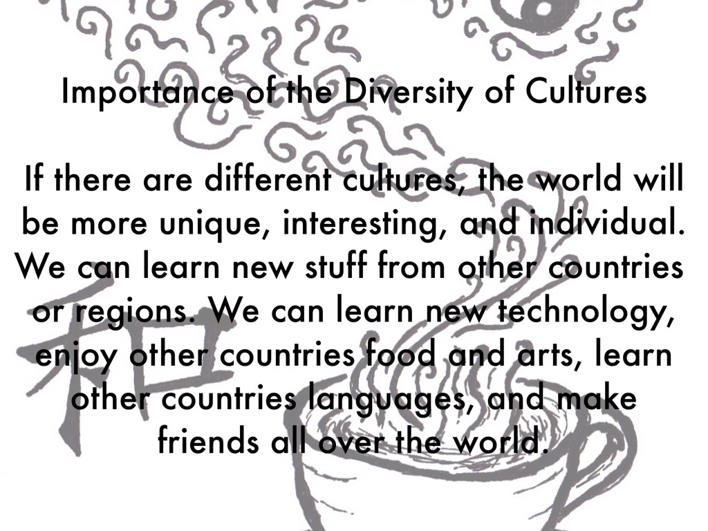 If there are different cultures, the world will be more unique, interesting, and individual. We can learn new stuff from other countries or regions. We can learn new technology, enjoy other countries food and arts, learn other countries languages, and make friends all over the world.