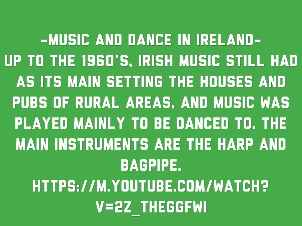 Up to the 1960’s, Irish music still had as its main setting the houses and pubs of rural areas, and music was played mainly to be danced to. The main instruments are the harp and bagpipe.