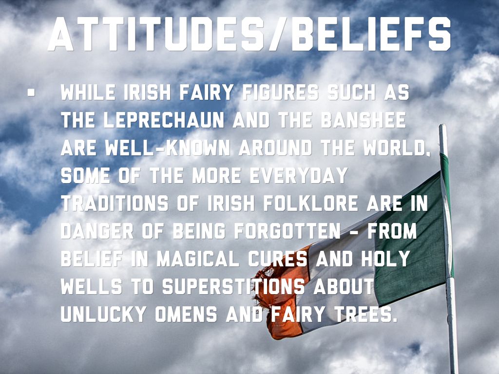 - While Irish fairy figures such as the Leprechaun and the Banshee are well-known around the world, some of the more everyday traditions of Irish folklore are in danger of being forgotten - from belief in magical cures and holy wells to superstitions about unlucky omens and fairy trees.