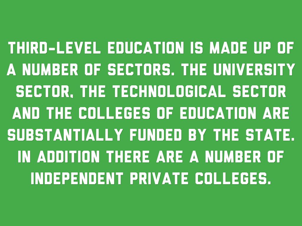 THIRD-LEVEL EDUCATION IS MADE UP OF A NUMBER OF SECTORS. THE UNIVERSITY SECTOR, THE TECHNOLOGICAL SECTOR AND THE COLLEGES OF EDUCATION ARE SUBSTANTIALLY FUNDED BY THE STATE. IN ADDITION THERE ARE A NUMBER OF INDEPENDENT PRIVATE COLLEGES.