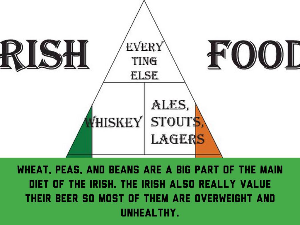 WHEAT, PEAS, AND BEANS ARE A BIG PART OF THE MAIN DIET OF THE IRISH. THE IRISH ALSO REALLY VALUE THEIR BEER SO MOST OF THEM ARE OVERWEIGHT AND UNHEALTHY.