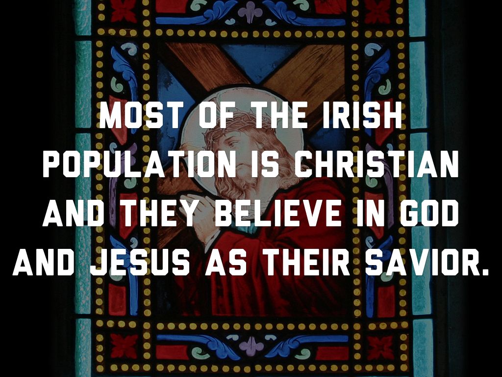 Most of the Irish population is Christian and they believe in God and Jesus as their savior.