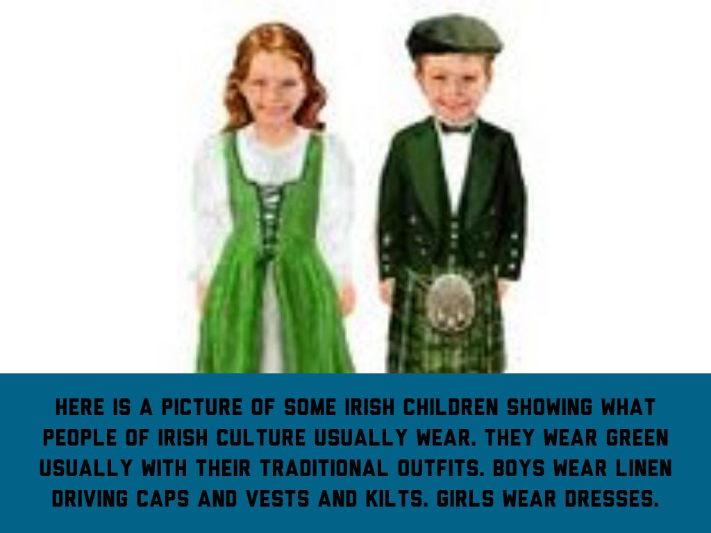 Here is a picture of some Irish children showing what people of Irish culture usually wear. They wear green usually with their traditional outfits. Boys wear linen driving caps and vests and kilts. Girls wear dresses.