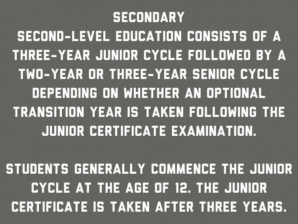 Second-level education consists of a three-year junior cycle followed by a two-year or three-year senior cycle depending on whether an optional Transition Year is taken following the Junior Certificate examination.