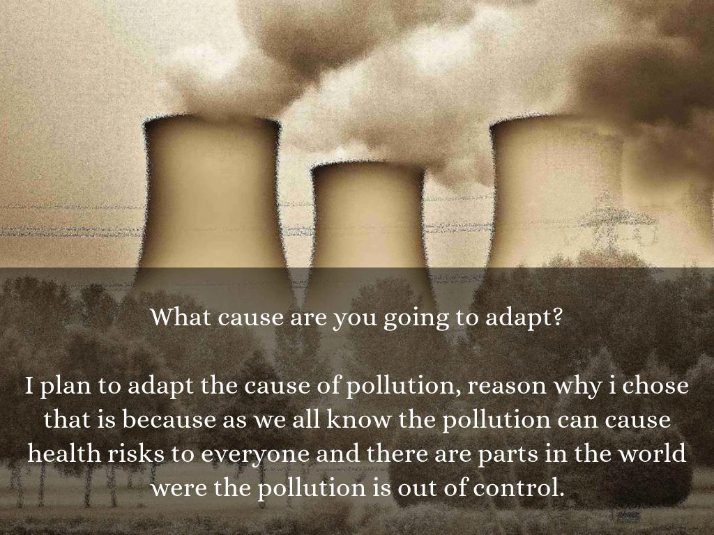 I plan to adapt the cause of pollution, reason why i chose that is because as we all know the pollution can cause health risks to everyone and there are parts in the world were the pollution is out of control.