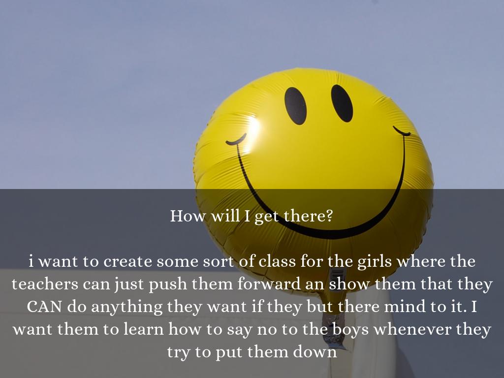 i want to create some sort of class for the girls where the teachers can just push them forward an show them that they CAN do anything they want if they but there mind to it. I want them to learn how to say no to the boys whenever they try to put them down