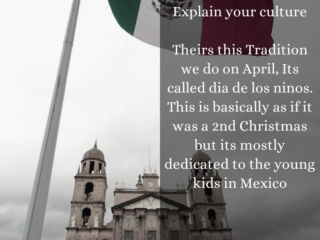 Theirs this Tradition we do on April, Its called dia de los ninos. This is basically as if it was a 2nd Christmas but its mostly dedicated to the young kids in Mexico
