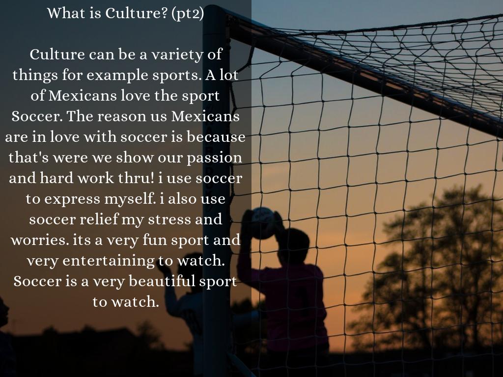 Culture can be a variety of things for example sports. A lot of Mexicans love the sport Soccer. The reason us Mexicans are in love with soccer is because that's were we show our passion and hard work thru! i use soccer to express myself. i also use soccer relief my stress and worries. its a very fun sport and very entertaining to watch. Soccer is a very beautiful sport to watch.