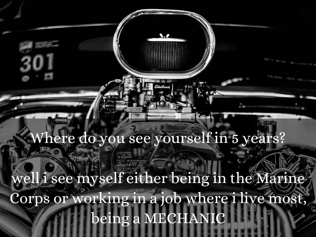 well i see myself either being in the Marine Corps or working in a job where i live most, being a MECHANIC