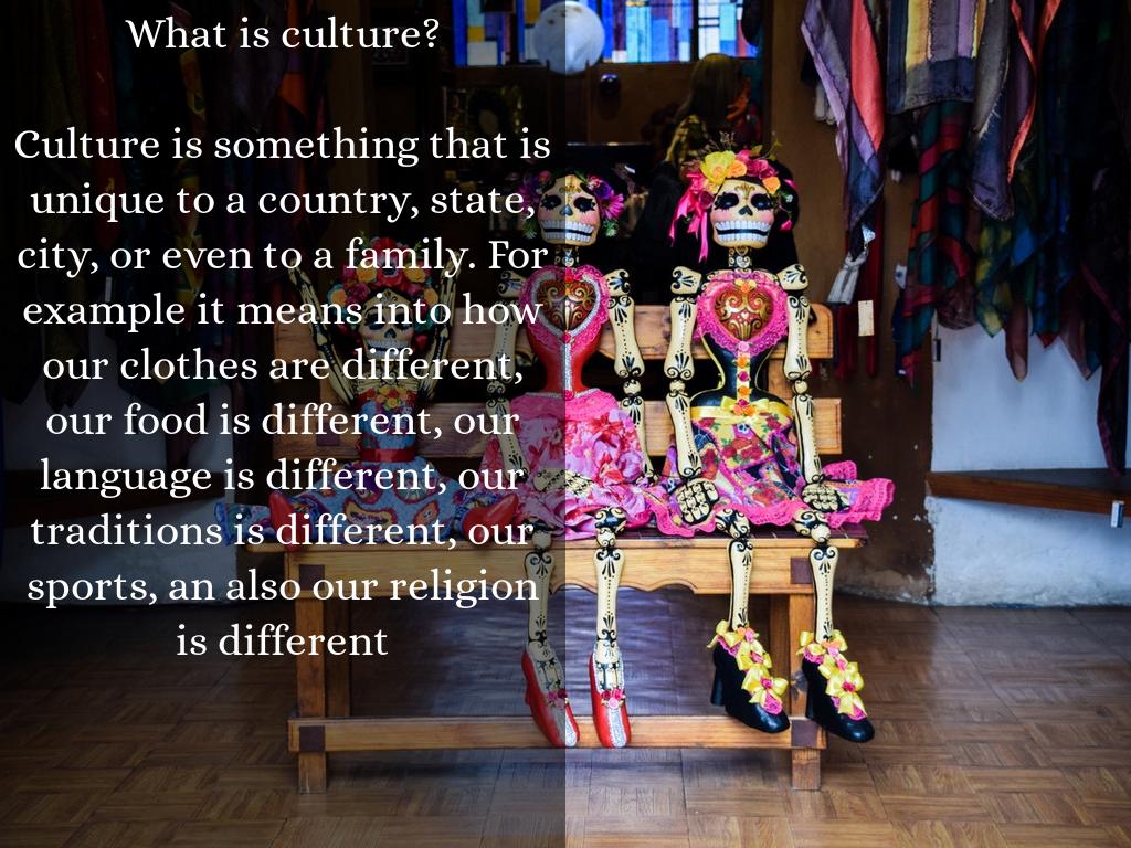 Culture is something that is unique to a country, state, city, or even to a family. For example it means into how our clothes are different, our food is different, our language is different, our traditions is different, our sports, an also our religion is different