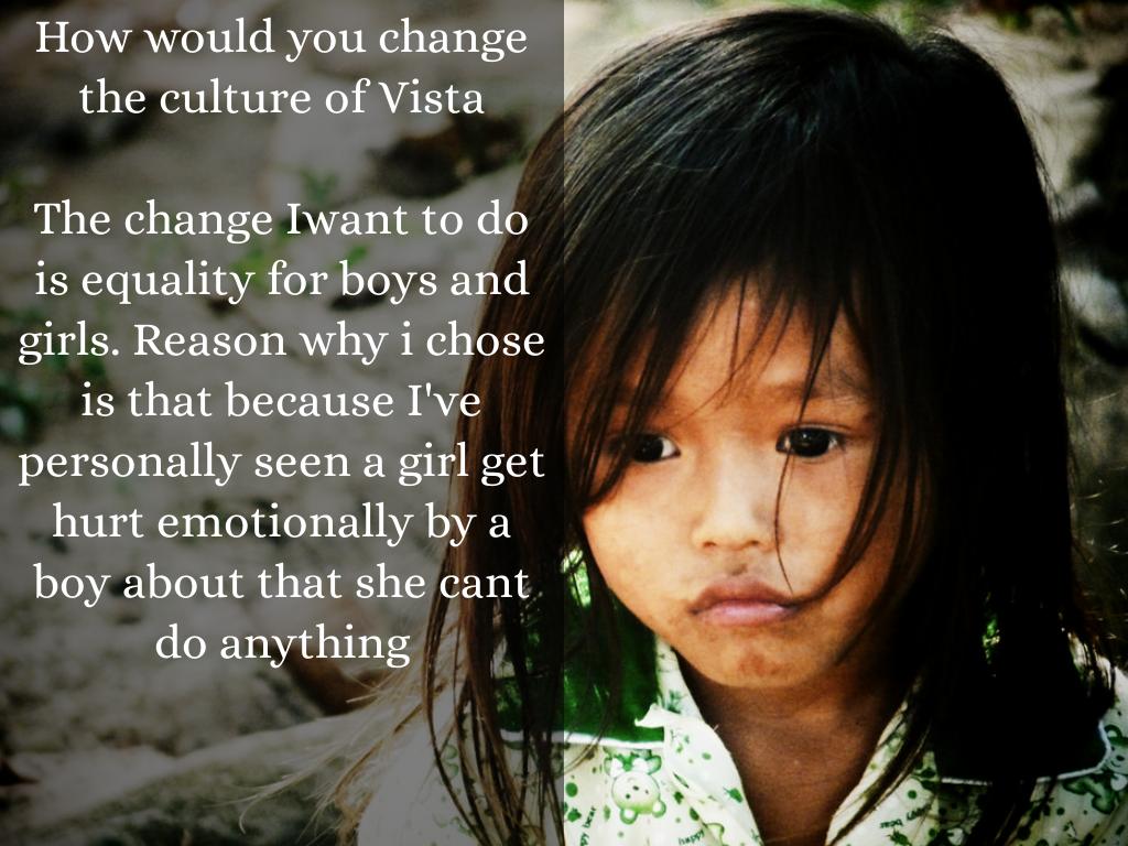 The change Iwant to do is equality for boys and girls. Reason why i chose is that because I've personally seen a girl get hurt emotionally by a boy about that she cant do anything