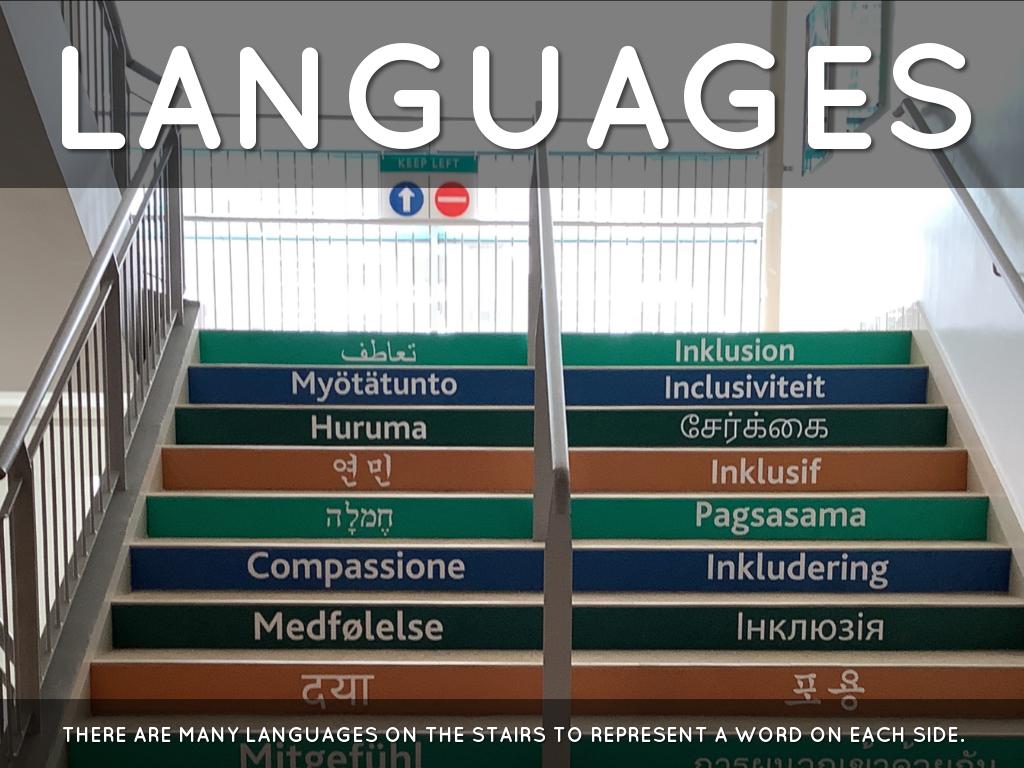 THERE ARE MANY LANGUAGES ON THE STAIRS TO REPRESENT A WORD ON EACH SIDE.
