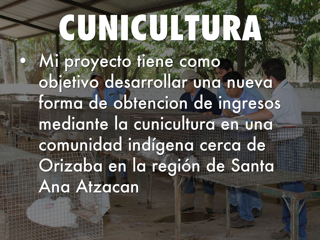Mi proyecto tiene como objetivo desarrollar una nueva forma de obtencion de ingresos mediante la cunicultura en una comunidad indígena cerca de Orizaba en la región de Santa Ana Atzacan