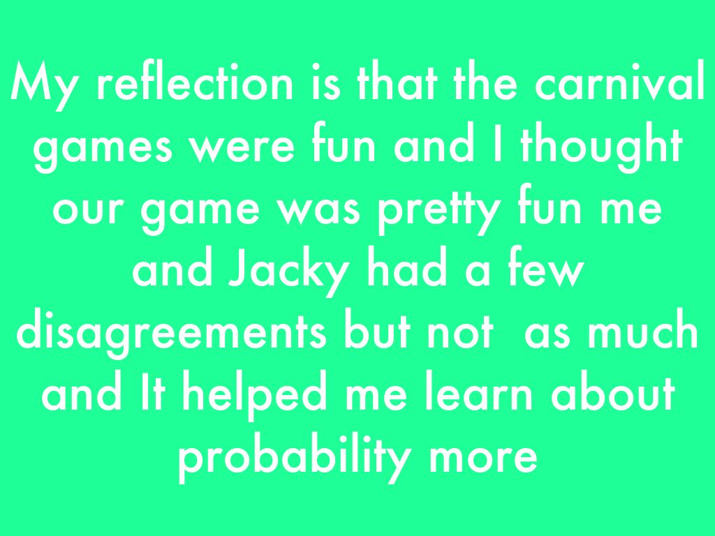 My reflection is that the carnival games were fun and I thought our game was pretty fun me and Jacky had a few disagreements but not as much and It helped me learn about probability more