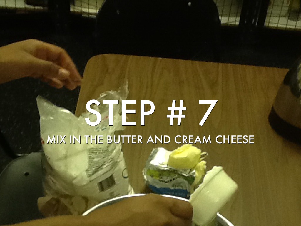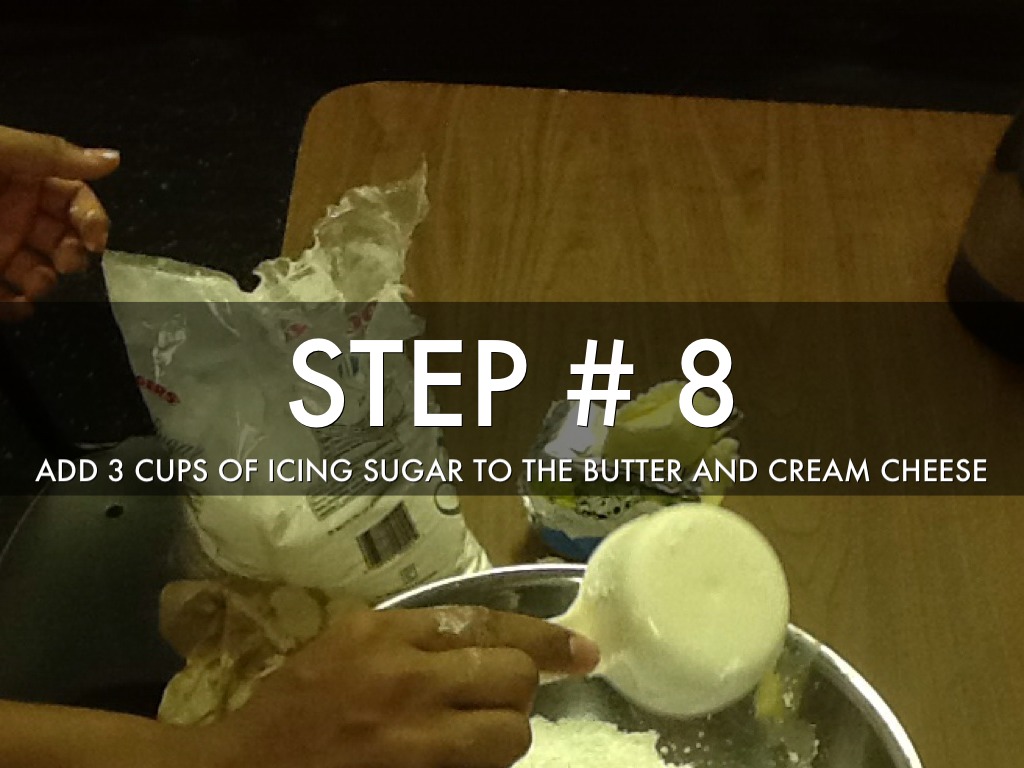 ADD 3 CUPS OF ICING SUGAR TO THE BUTTER AND CREAM CHEESE