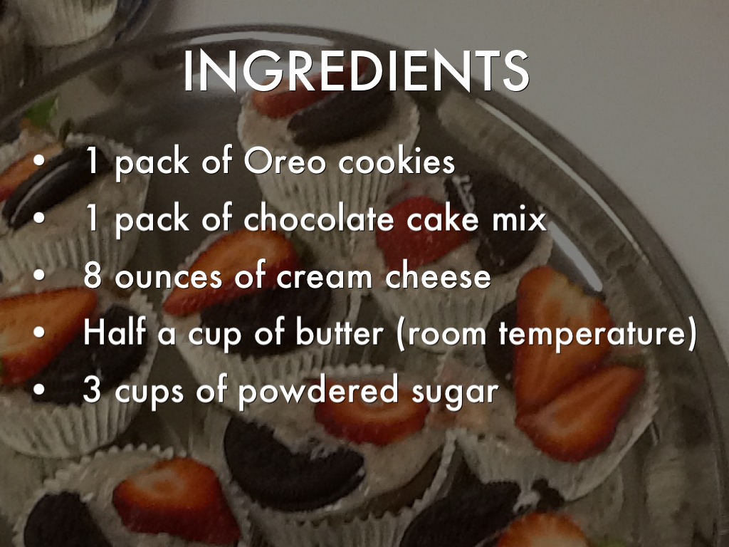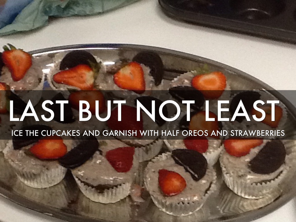 ICE THE CUPCAKES AND GARNISH WITH HALF OREOS AND STRAWBERRIES