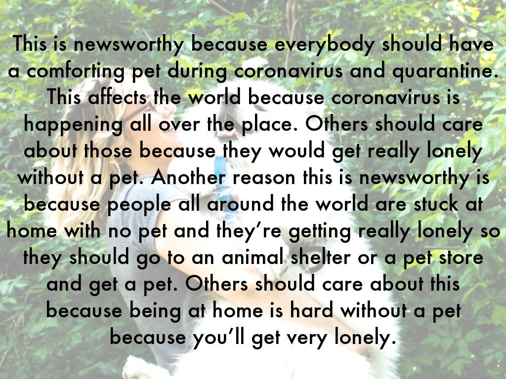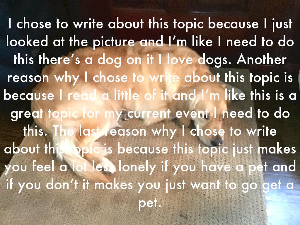 I chose to write about this topic because I just looked at the picture and I’m like I need to do this there’s a dog on it I love dogs. Another reason why I chose to write about this topic is because I read a little of it and I’m like this is a great topic for my current event I need to do this. The last reason why I chose to write about this topic is because this topic just makes you feel a lot less lonely if you have a pet and if you don’t it makes you just want to go get a pet.