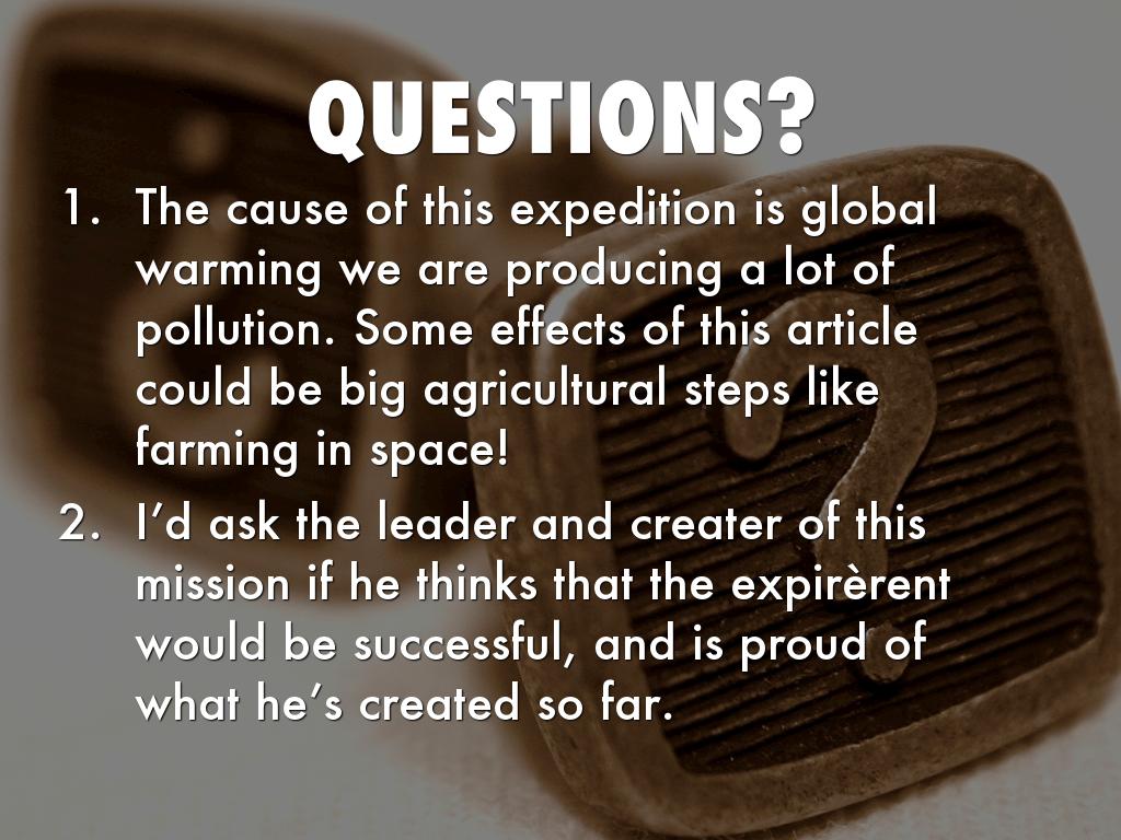 - The cause of this expedition is global warming we are producing a lot of pollution. Some effects of this article could be big agricultural steps like farming in space!