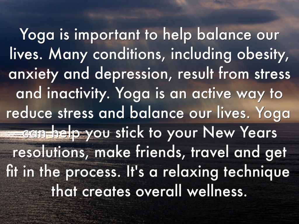 Yoga is important to help balance our lives. Many conditions, including obesity, anxiety and depression, result from stress and inactivity. Yoga is an active way to reduce stress and balance our lives. Yoga can help you stick to your New Years resolutions, make friends, travel and get fit in the process. It's a relaxing technique that creates overall wellness.