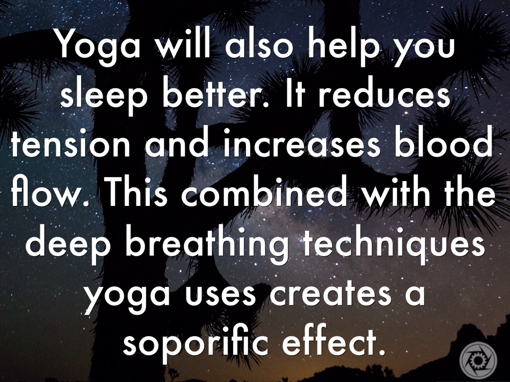 Yoga will also help you sleep better. It reduces tension and increases blood flow. This combined with the deep breathing techniques yoga uses creates a soporific effect.