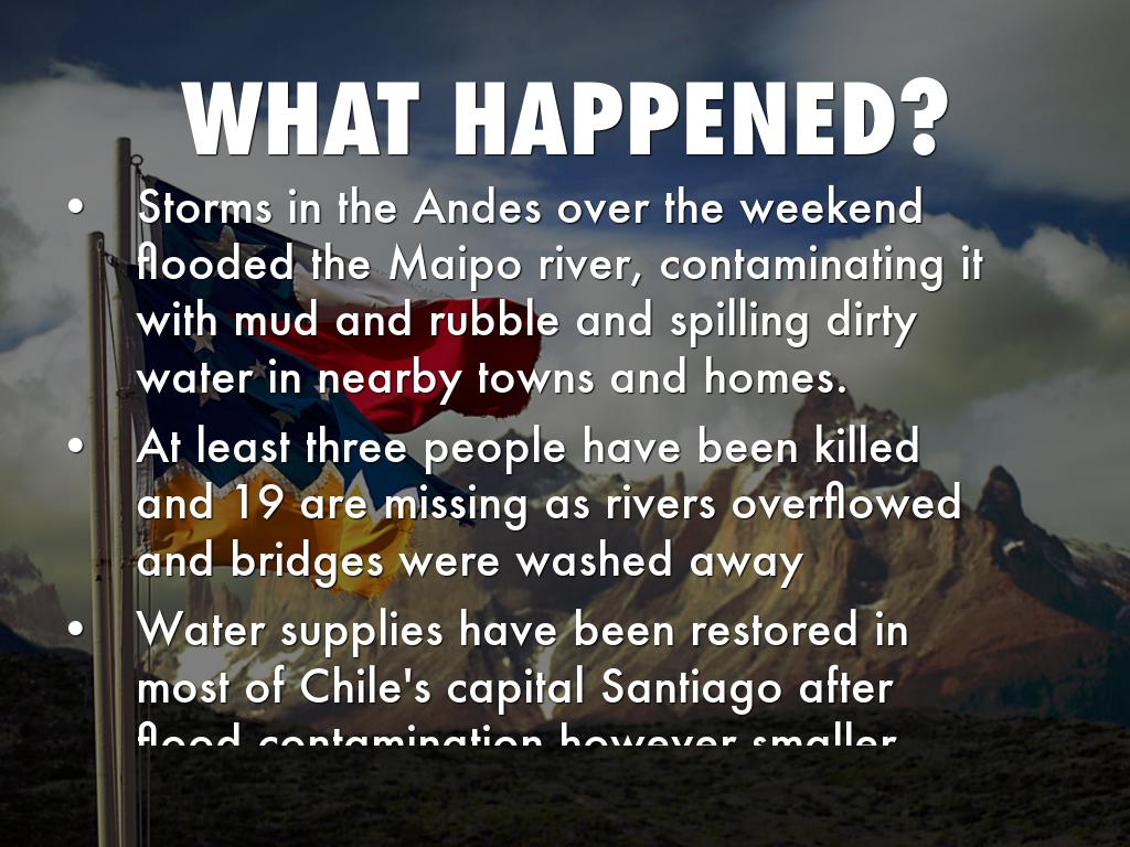 Storms in the Andes over the weekend flooded the Maipo river, contaminating it with mud and rubble and spilling dirty water in nearby towns and homes.