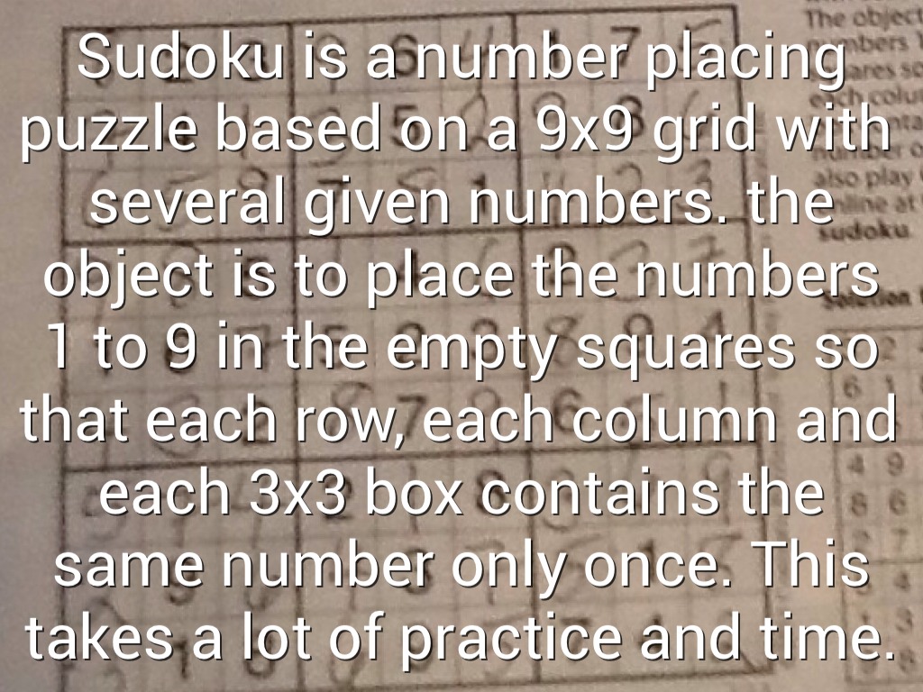 Sudoku is a number placing puzzle based on a 9x9 grid with several given numbers. the object is to place the numbers 1 to 9 in the empty squares so that each row, each column and each 3x3 box contains the same number only once. This takes a lot of practice and time.