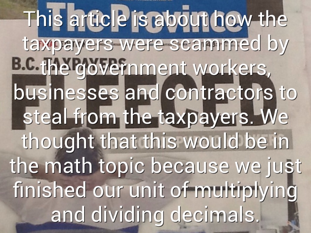 This article is about how the taxpayers were scammed by the government workers, businesses and contractors to steal from the taxpayers. We thought that this would be in the math topic because we just finished our unit of multiplying and dividing decimals.