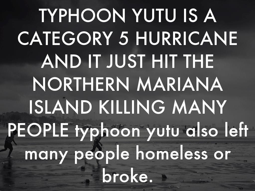 TYPHOON YUTU IS A CATEGORY 5 HURRICANE AND IT JUST HIT THE NORTHERN MARIANA ISLAND KILLING MANY PEOPLE typhoon yutu also left many people homeless or broke.