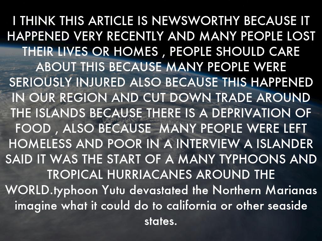 I THINK THIS ARTICLE IS NEWSWORTHY BECAUSE IT HAPPENED VERY RECENTLY AND MANY PEOPLE LOST THEIR LIVES OR HOMES , PEOPLE SHOULD CARE ABOUT THIS BECAUSE MANY PEOPLE WERE SERIOUSLY INJURED ALSO BECAUSE THIS HAPPENED IN OUR REGION AND CUT DOWN TRADE AROUND THE ISLANDS BECAUSE THERE IS A DEPRIVATION OF FOOD , ALSO BECAUSE MANY PEOPLE WERE LEFT HOMELESS AND POOR IN A INTERVIEW A ISLANDER SAID IT WAS THE START OF A MANY TYPHOONS AND TROPICAL HURRIACANES AROUND THE WORLD.typhoon Yutu devastated the Northern Marianas imagine what it could do to california or other seaside states.
