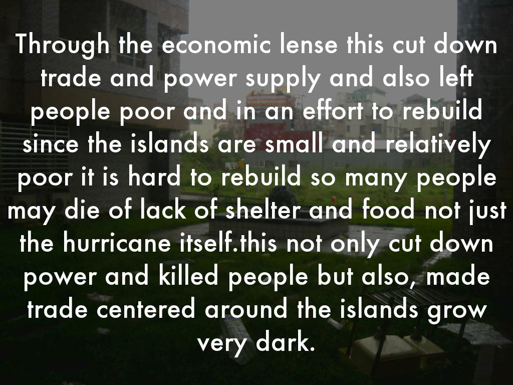 Through the economic lense this cut down trade and power supply and also left people poor and in an effort to rebuild since the islands are small and relatively poor it is hard to rebuild so many people may die of lack of shelter and food not just the hurricane itself.this not only cut down power and killed people but also, made trade centered around the islands grow very dark.