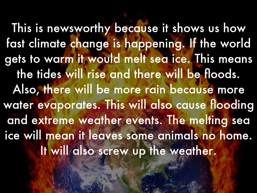 This is newsworthy because it shows us how fast climate change is happening. If the world gets to warm it would melt sea ice. This means the tides will rise and there will be floods. Also, there will be more rain because more water evaporates. This will also cause flooding and extreme weather events. The melting sea ice will mean it leaves some animals no home. It will also screw up the weather.