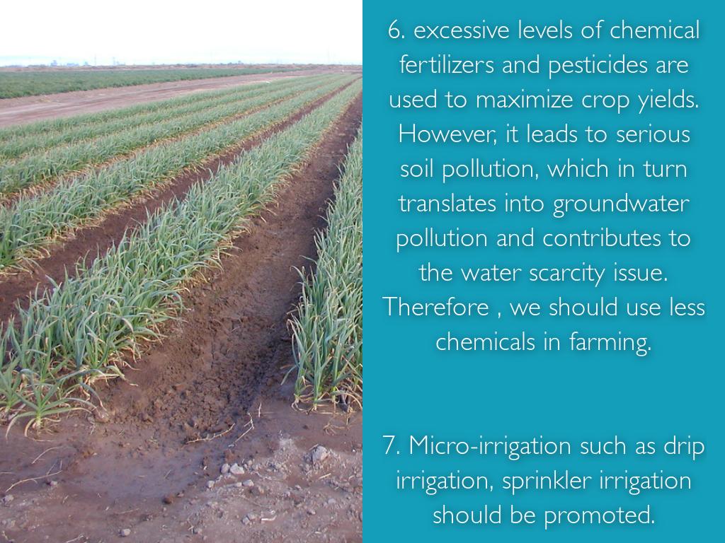 6. excessive levels of chemical fertilizers and pesticides are used to maximize crop yields. However, it leads to serious soil pollution, which in turn translates into groundwater pollution and contributes to the water scarcity issue. Therefore , we should use less chemicals in farming.