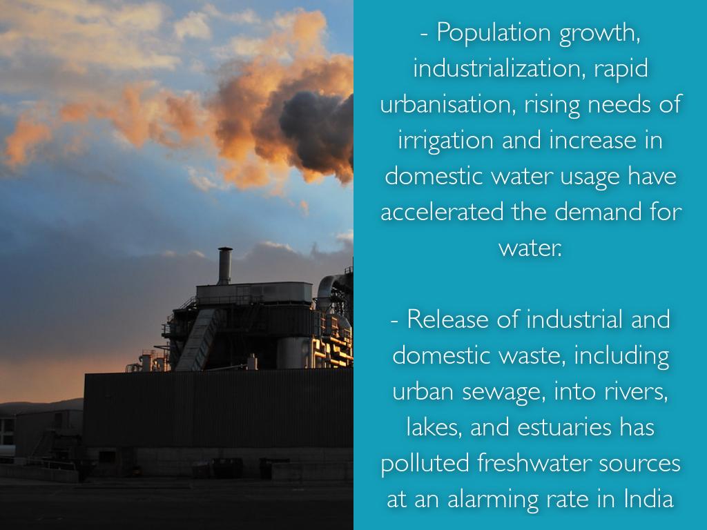 - Release of industrial and domestic waste, including urban sewage, into rivers, lakes, and estuaries has polluted freshwater sources at an alarming rate in India