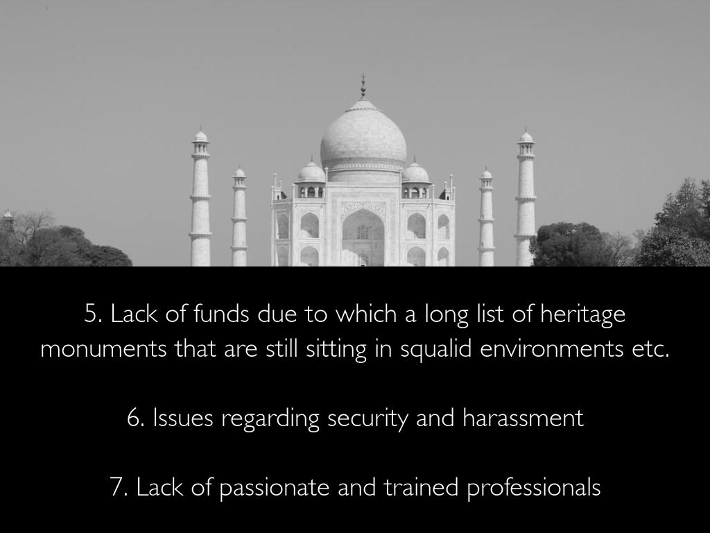 5. Lack of funds due to which a long list of heritage monuments that are still sitting in squalid environments etc.