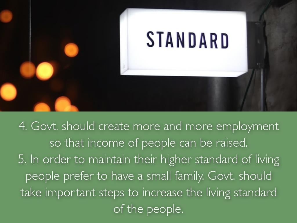 5. In order to maintain their higher standard of living people prefer to have a small family. Govt. should take important steps to increase the living standard of the people.
