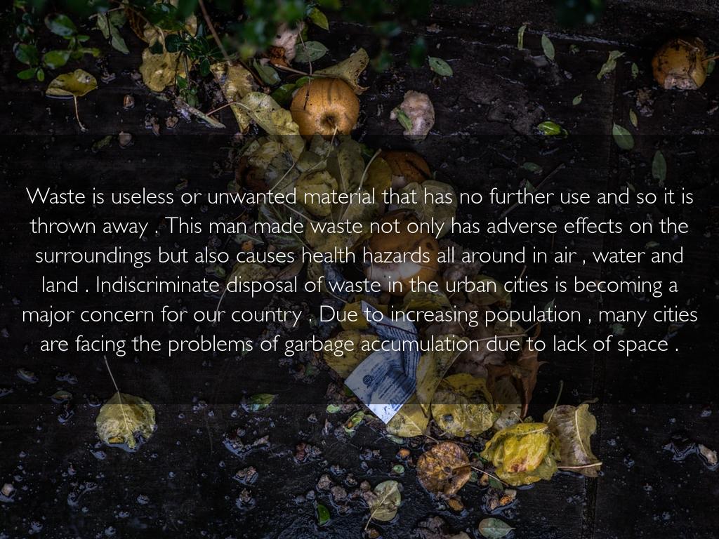 Waste is useless or unwanted material that has no further use and so it is thrown away . This man made waste not only has adverse effects on the surroundings but also causes health hazards all around in air , water and land . Indiscriminate disposal of waste in the urban cities is becoming a major concern for our country . Due to increasing population , many cities are facing the problems of garbage accumulation due to lack of space .