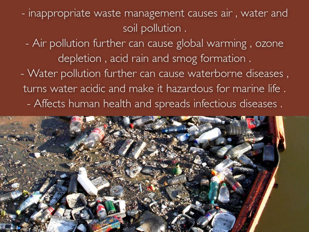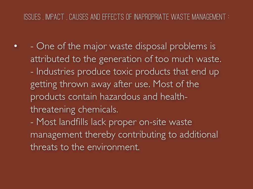 ISSUES , IMPACT , CAUSES AND EFFECTS OF INAPROPRIATE WASTE MANAGEMENT :