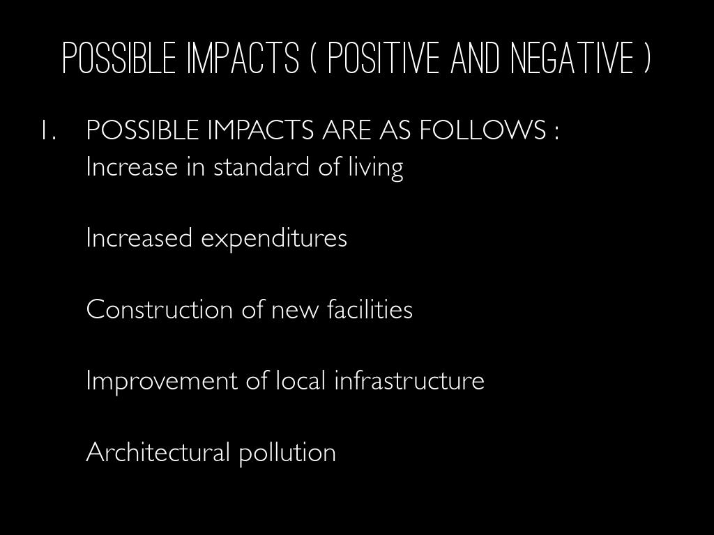 • POSSIBLE IMPACTS ARE AS FOLLOWS : Increase in standard of living Increased expenditures Construction of new facilities Improvement of local infrastructure Architectural pollution Overcrowding Preservation of heritage