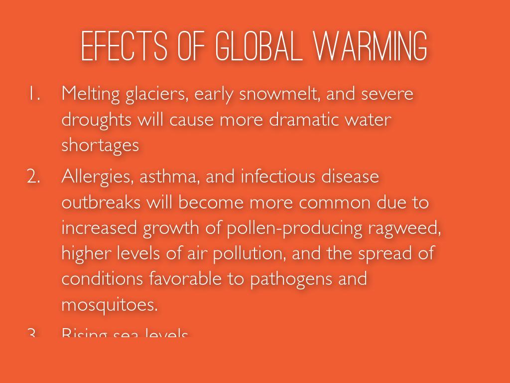 • Allergies, asthma, and infectious disease outbreaks will become more common due to increased growth of pollen-producing ragweed, higher levels of air pollution, and the spread of conditions favorable to pathogens and mosquitoes.