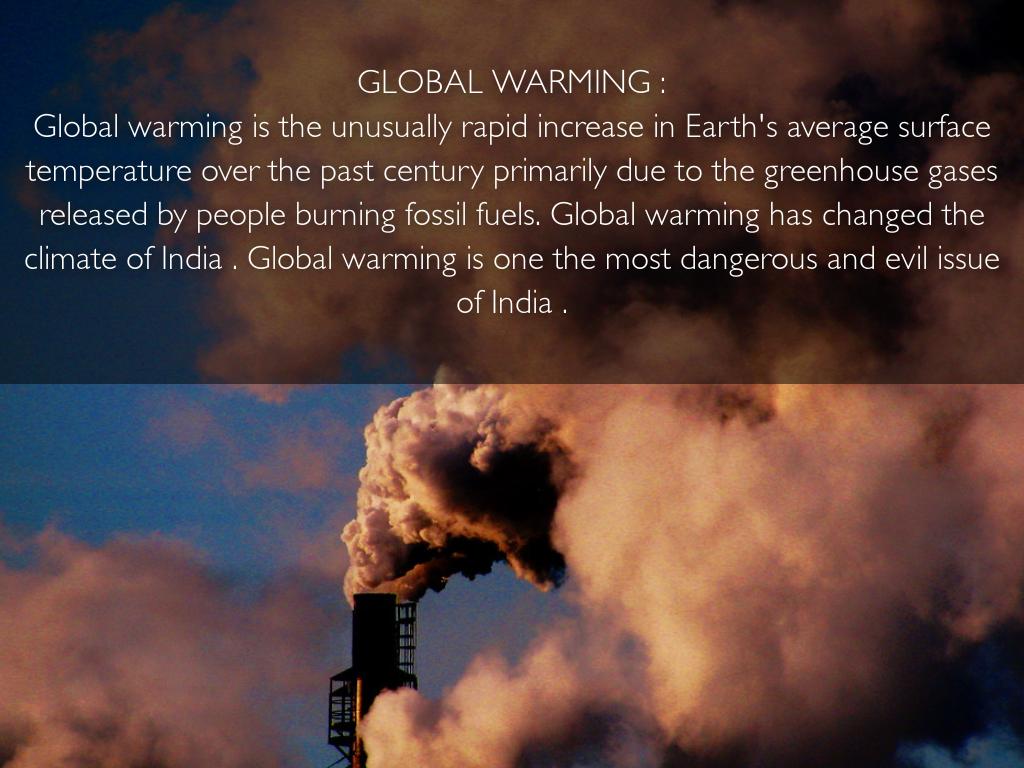 Global warming is the unusually rapid increase in Earth's average surface temperature over the past century primarily due to the greenhouse gases released by people burning fossil fuels. Global warming has changed the climate of India . Global warming is one the most dangerous and evil issue of India .