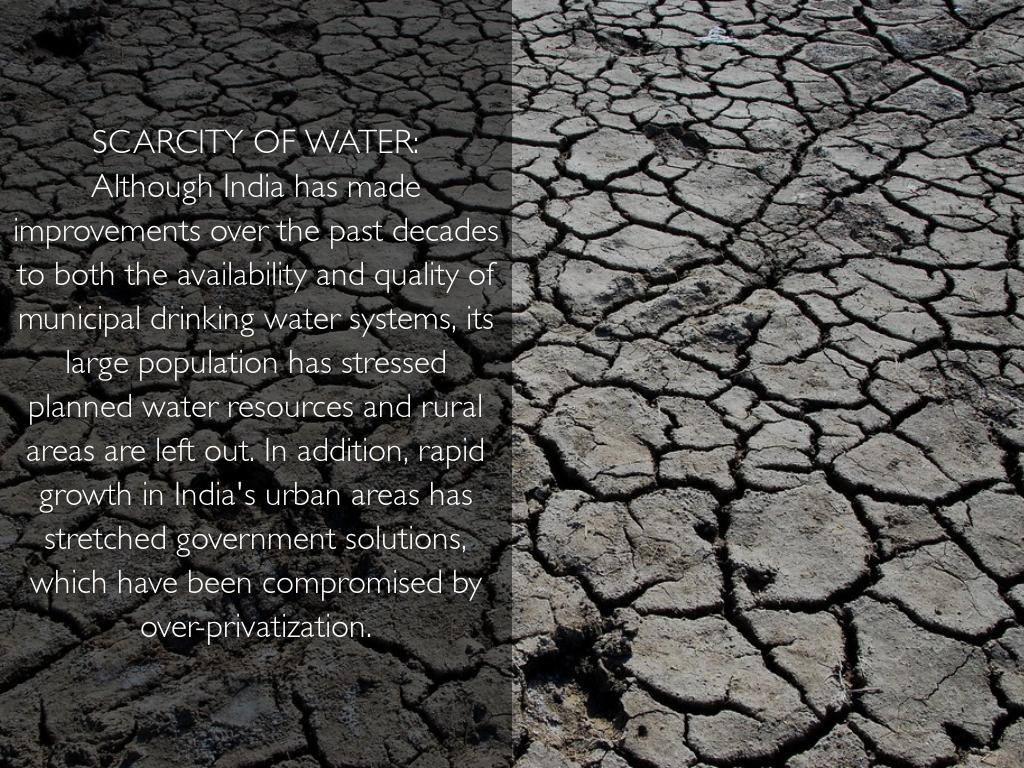 Although India has made improvements over the past decades to both the availability and quality of municipal drinking water systems, its large population has stressed planned water resources and rural areas are left out. In addition, rapid growth in India's urban areas has stretched government solutions, which have been compromised by over-privatization.